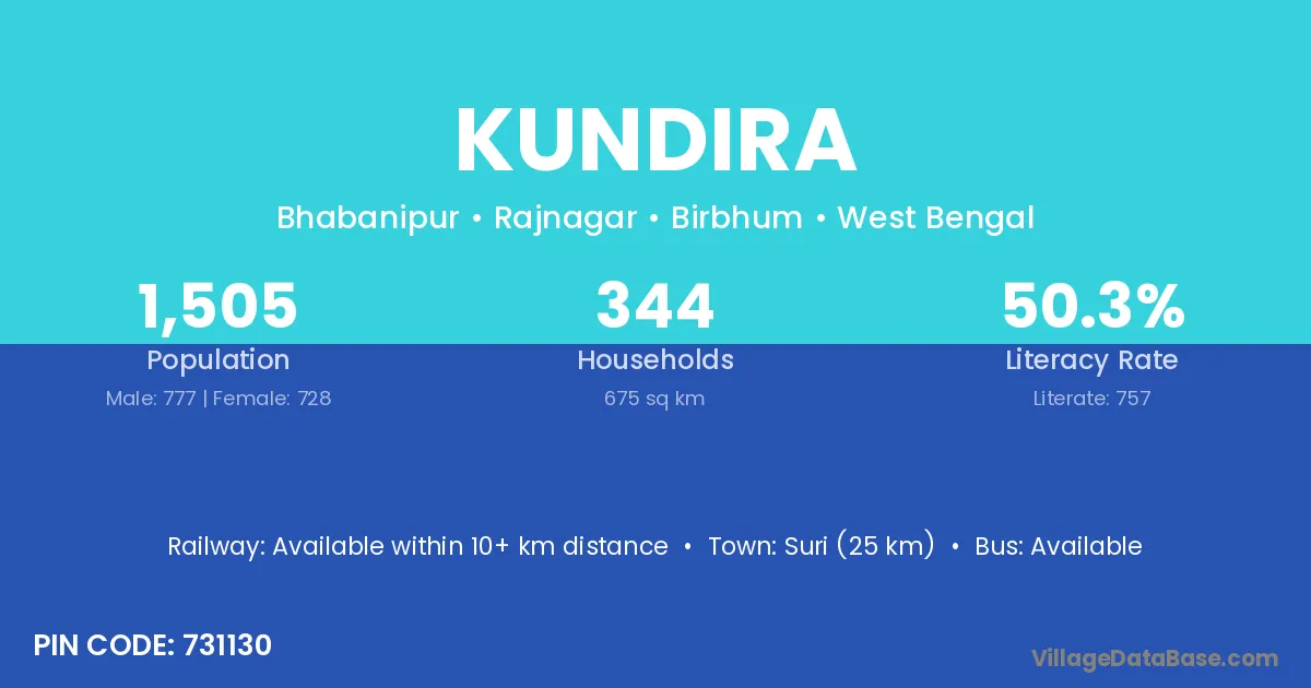 Suri (25 km) is the nearest town to Kundira village for major economic activities and is located approximately 25 km away.