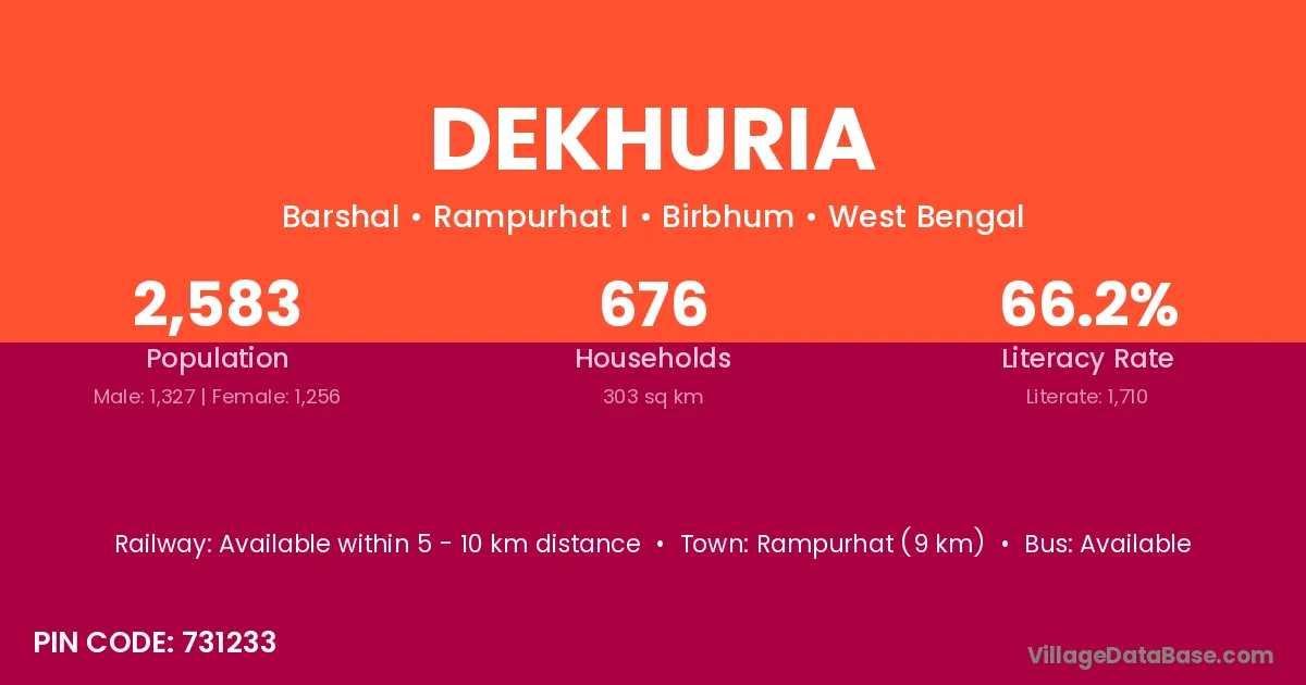 Rampurhat (9 km) is the nearest town to Dekhuria village for major economic activities and is located approximately 9 km away.