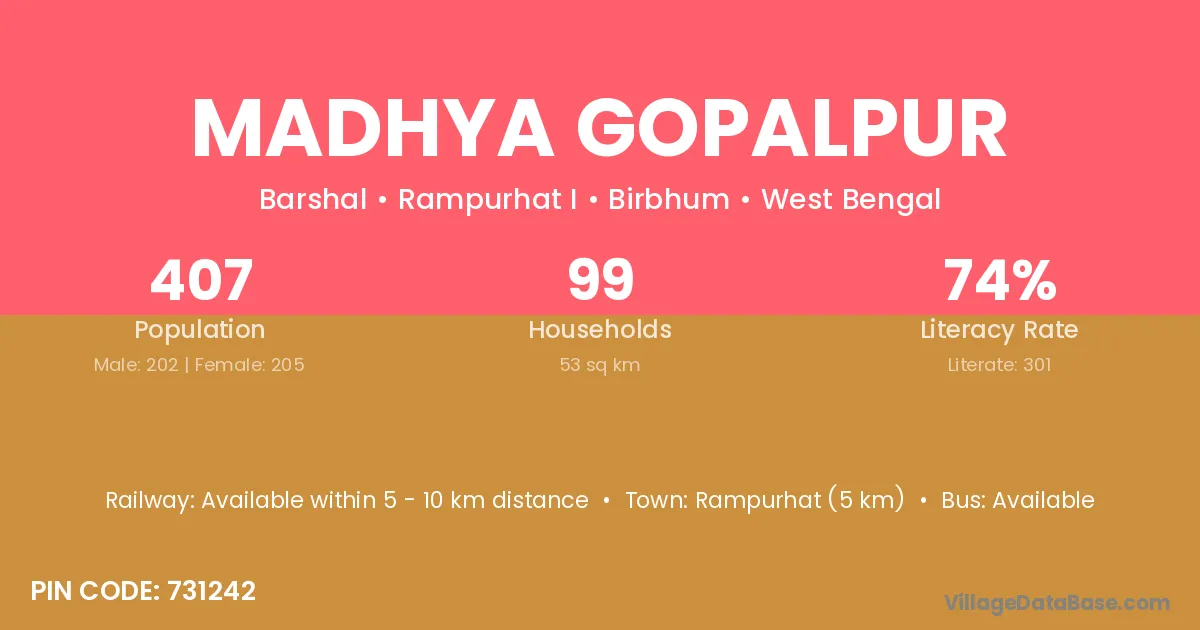 Rampurhat (5 km) is the nearest town to Madhya Gopalpur village for major economic activities and is located approximately 5 km away.