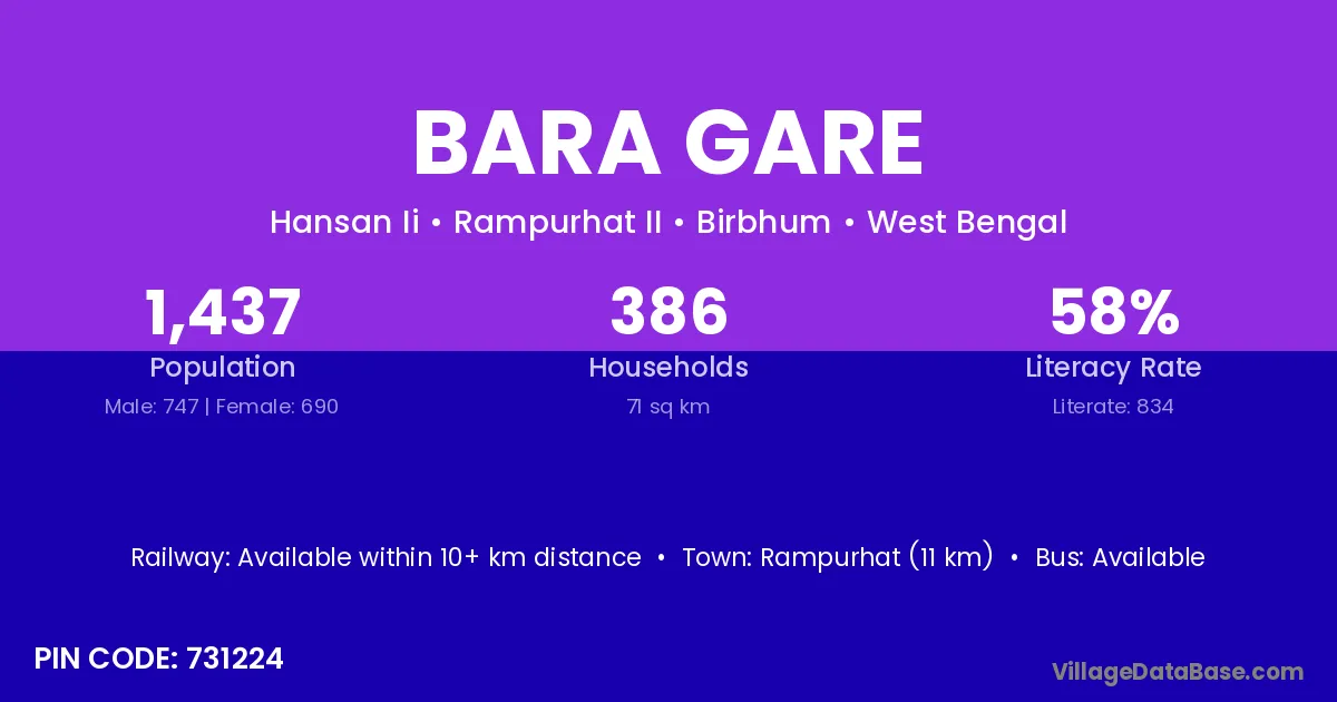 Rampurhat (11 km) is the nearest town to Bara Gare village for major economic activities and is located approximately 11 km away.