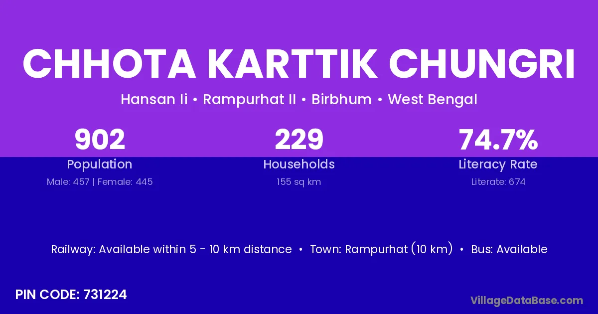 Rampurhat (10 km) is the nearest town to Chhota Karttik Chungri village for major economic activities and is located approximately 10 km away.