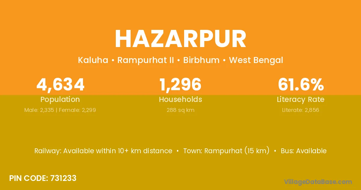 Rampurhat (15 km) is the nearest town to Hazarpur village for major economic activities and is located approximately 15 km away.