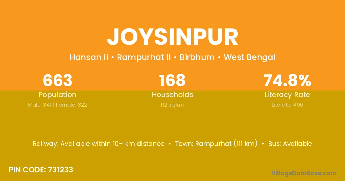 Rampurhat (111 km) is the nearest town to Joysinpur village for major economic activities and is located approximately 111 km away.