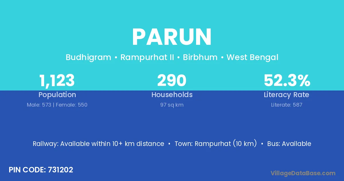 Rampurhat (10 km) is the nearest town to Parun village for major economic activities and is located approximately 10 km away.