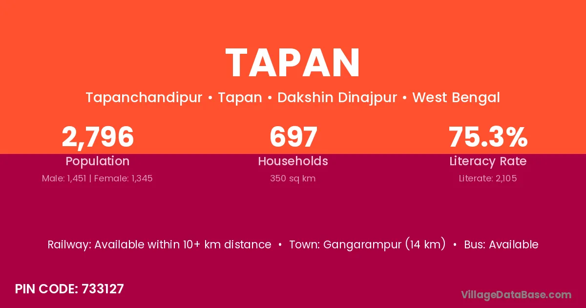 Rampurhat (13 km) is the nearest town to Tapan village for major economic activities and is located approximately 13 km away.