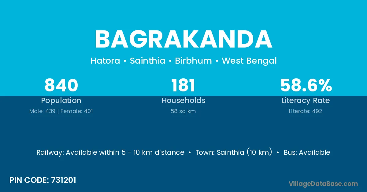 Sainthia (10 km) is the nearest town to Bagrakanda village for major economic activities and is located approximately 10 km away.