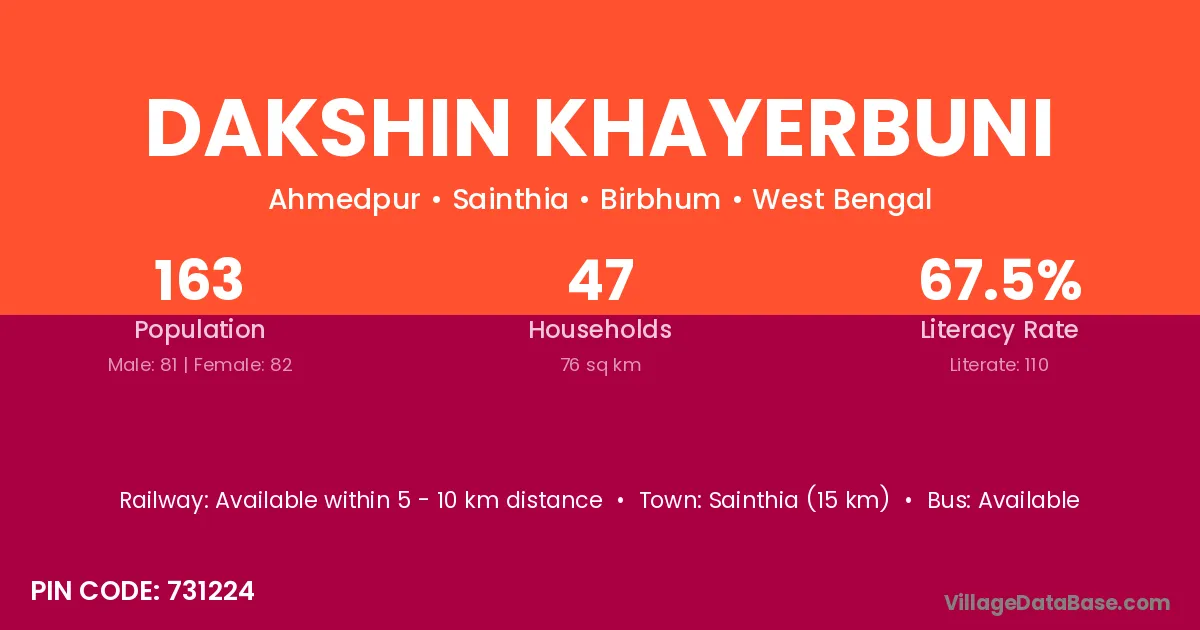 Sainthia (15 km) is the nearest town to Dakshin Khayerbuni village for major economic activities and is located approximately 15 km away.