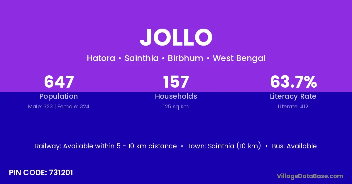 Sainthia (10 km) is the nearest town to Jollo village for major economic activities and is located approximately 10 km away.