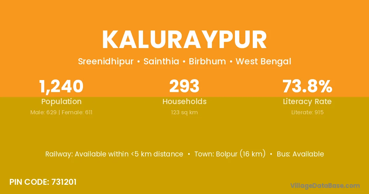 Bolpur (16 km) is the nearest town to Kaluraypur village for major economic activities and is located approximately 16 km away.