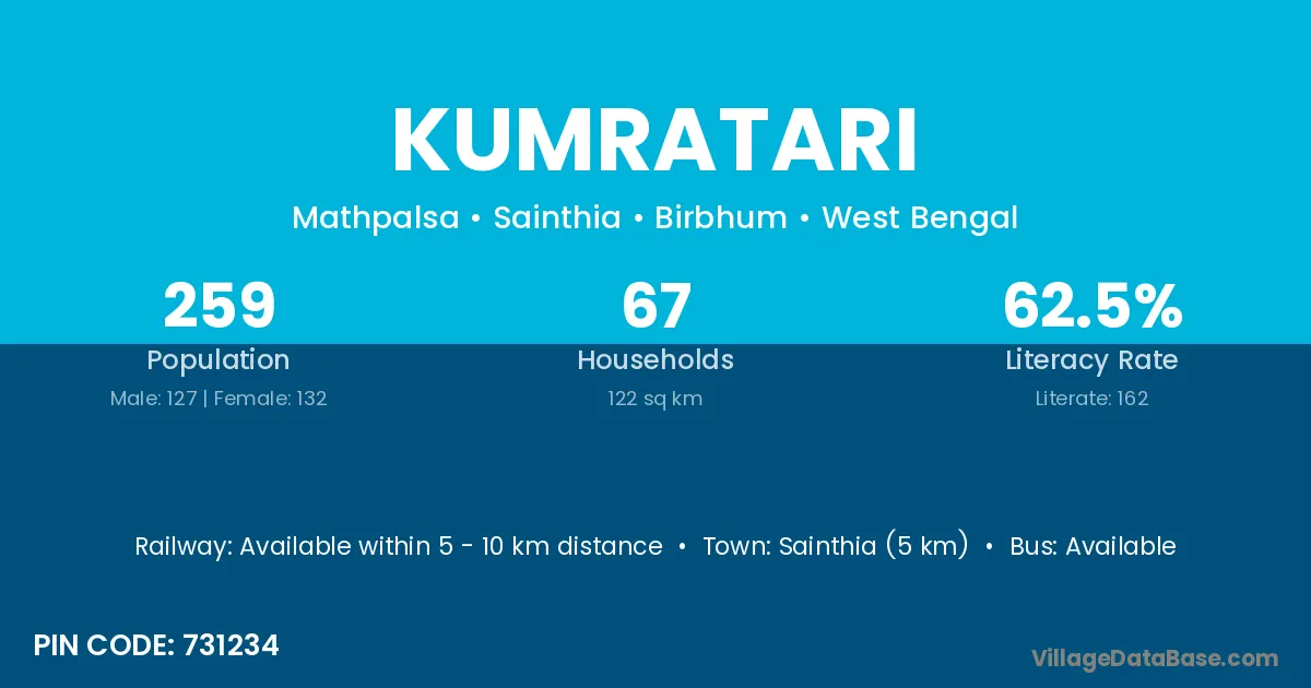 Sainthia (5 km) is the nearest town to Kumratari village for major economic activities and is located approximately 5 km away.