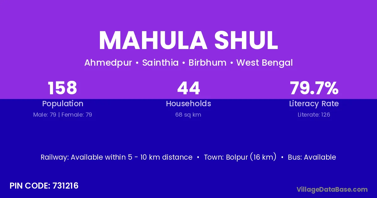 Bolpur (16 km) is the nearest town to Mahula Shul village for major economic activities and is located approximately 16 km away.