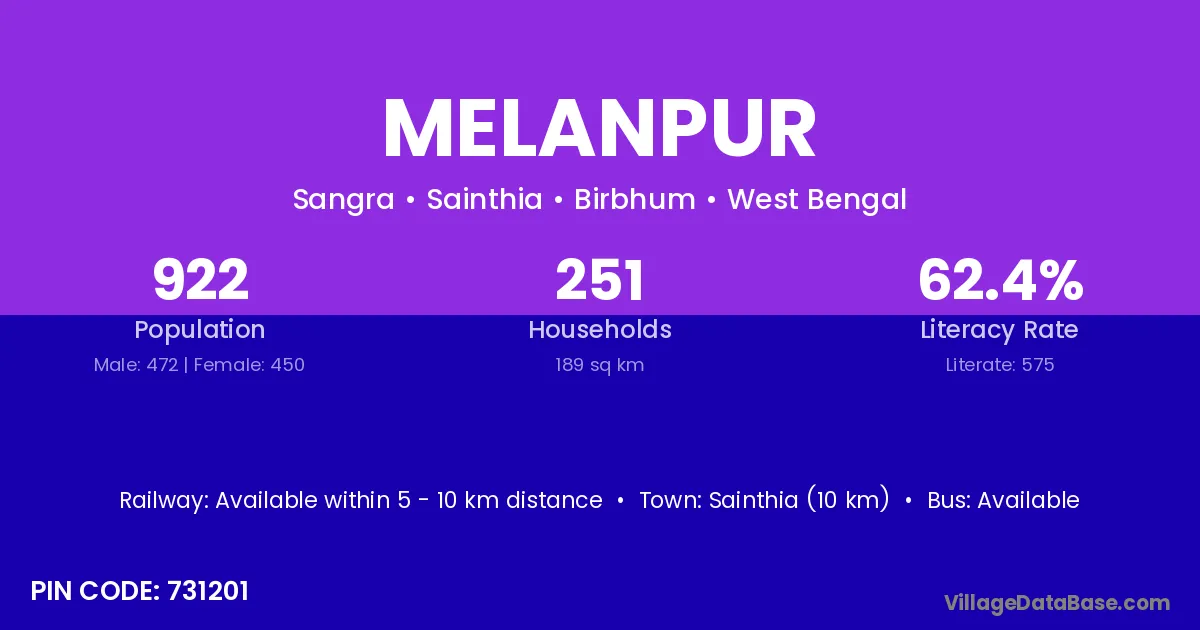 Sainthia (10 km) is the nearest town to Melanpur village for major economic activities and is located approximately 10 km away.