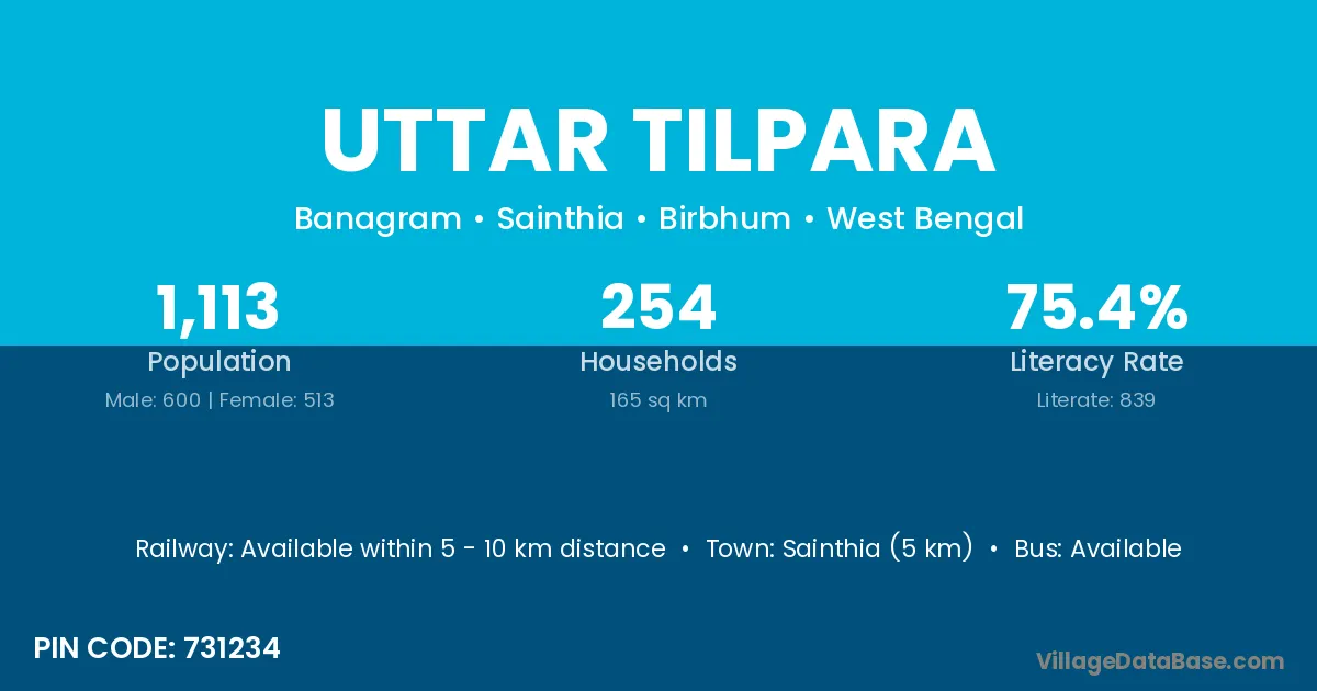 Sainthia (5 km) is the nearest town to Uttar Tilpara village for major economic activities and is located approximately 5 km away.