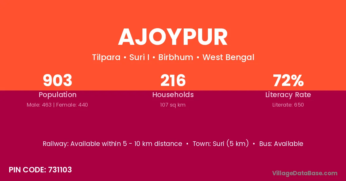 Suri (5 km) is the nearest town to Ajoypur village for major economic activities and is located approximately 5 km away.