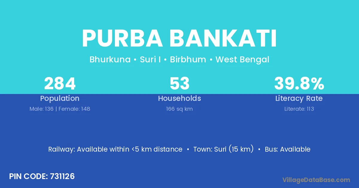 Suri (15 km) is the nearest town to Purba Bankati village for major economic activities and is located approximately 15 km away.