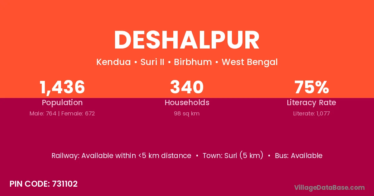 Suri (5 km) is the nearest town to Deshalpur village for major economic activities and is located approximately 5 km away.