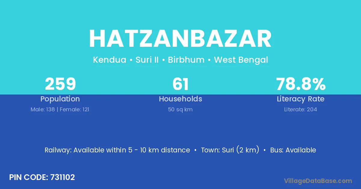 Suri (2 km) is the nearest town to Hatzanbazar village for major economic activities and is located approximately 2 km away.