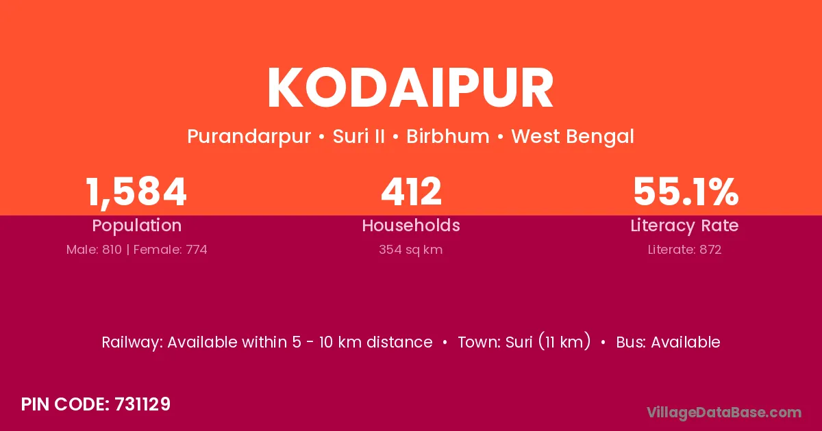 Suri (11 km) is the nearest town to Kodaipur village for major economic activities and is located approximately 11 km away.