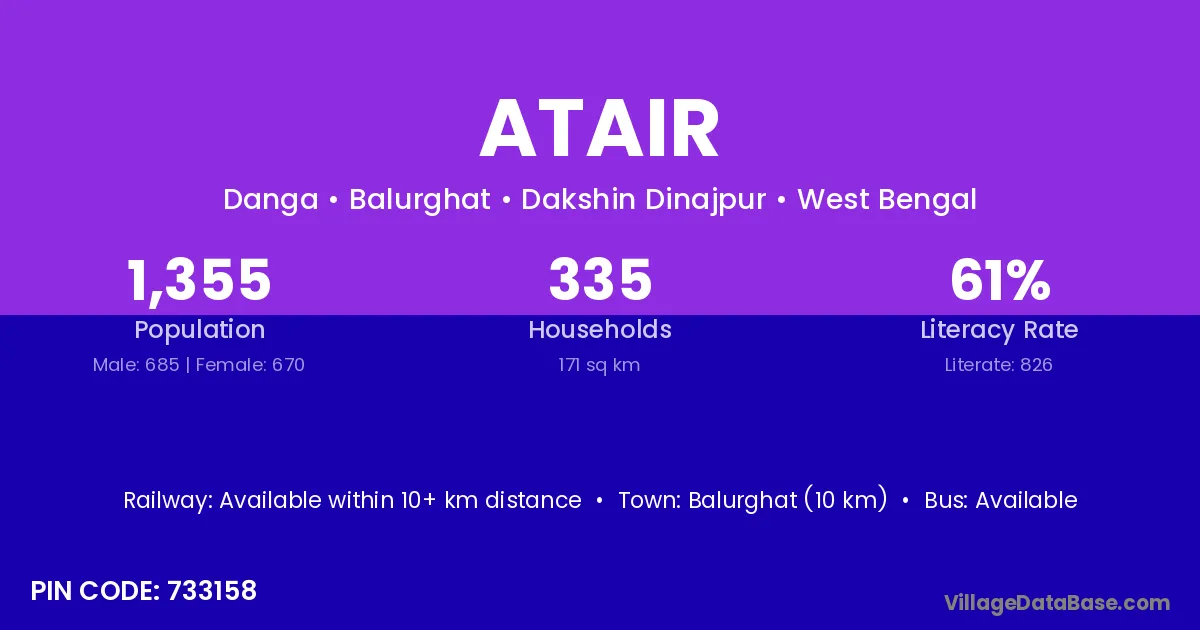 Balurghat (10 km) is the nearest town to Atair village for major economic activities and is located approximately 10 km away.