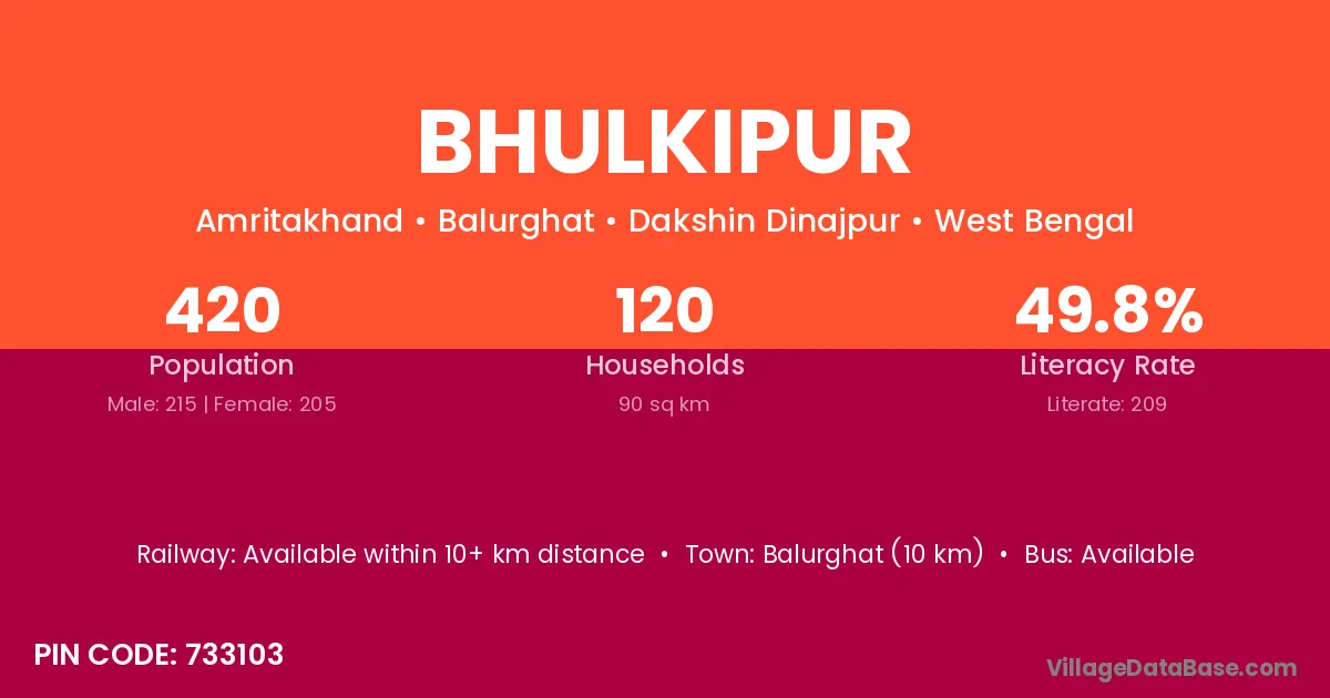 Balurghat (10 km) is the nearest town to Bhulkipur village for major economic activities and is located approximately 10 km away.