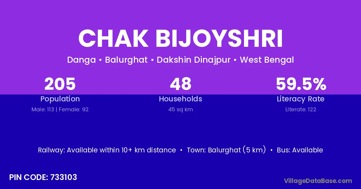Balurghat (5 km) is the nearest town to Chak Bijoyshri village for major economic activities and is located approximately 5 km away.