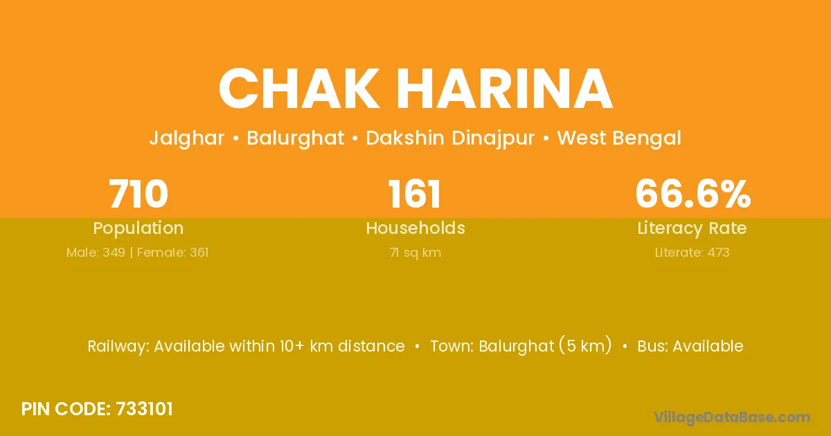 Balurghat (5 km) is the nearest town to Chak Harina village for major economic activities and is located approximately 5 km away.