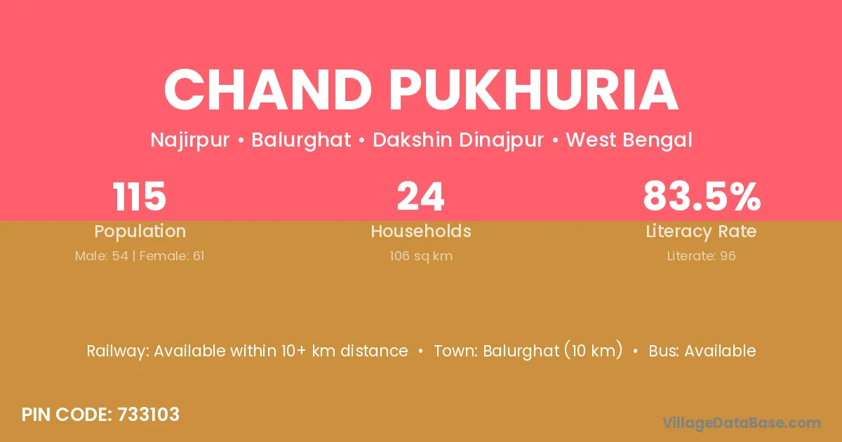 Balurghat (10 km) is the nearest town to Chand Pukhuria village for major economic activities and is located approximately 10 km away.