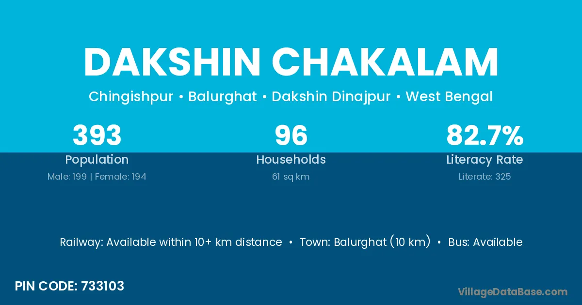 Dakshin Chakalam village has a total population of 393 people, of which 199 are males and 194 are females.