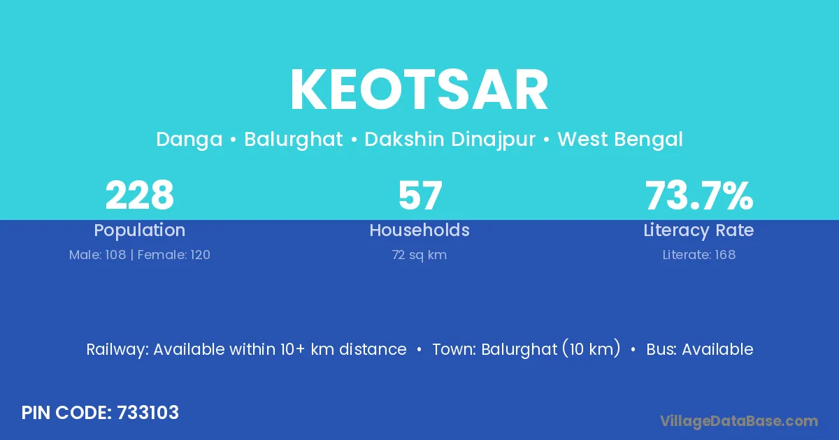 Balurghat (10 km) is the nearest town to Keotsar village for major economic activities and is located approximately 10 km away.