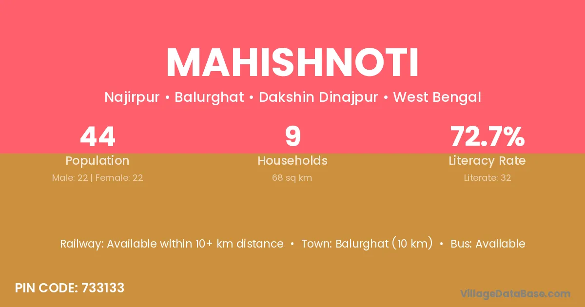 Mahishnoti village has a total population of 44 people, of which 22 are males and 22 are females.