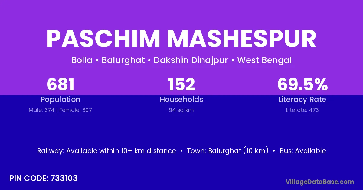Balurghat (10 km) is the nearest town to Paschim Mashespur village for major economic activities and is located approximately 10 km away.