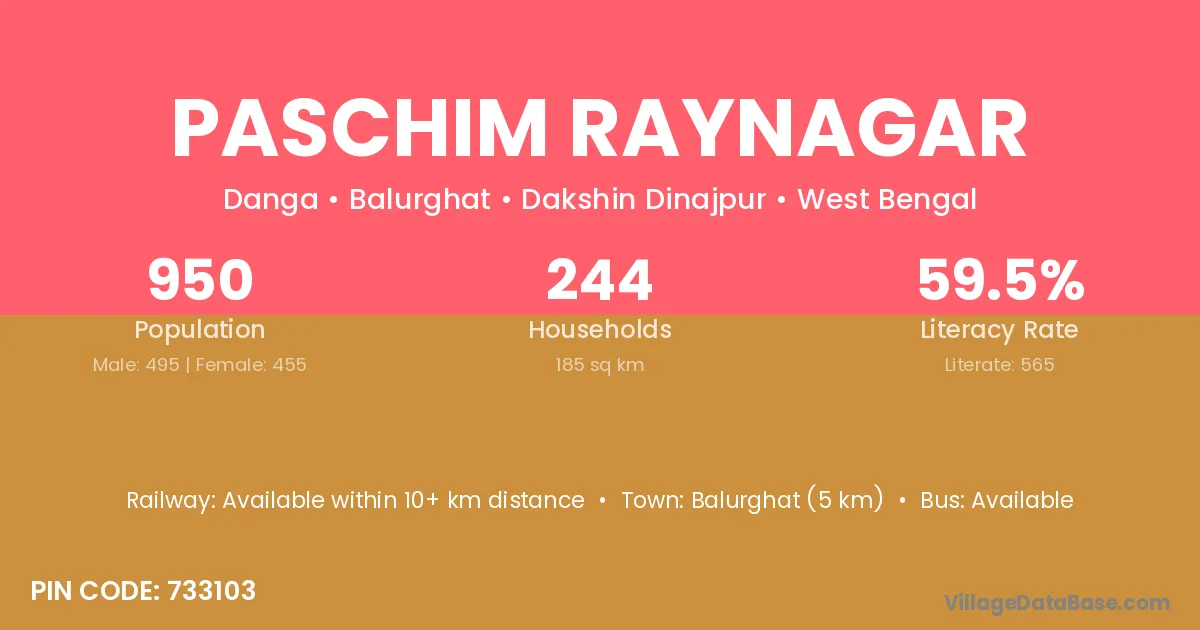 Balurghat (5 km) is the nearest town to Paschim Raynagar village for major economic activities and is located approximately 5 km away.