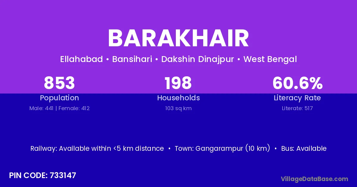 According to Census 2011 information, the village code of Barakhair village is 733147.