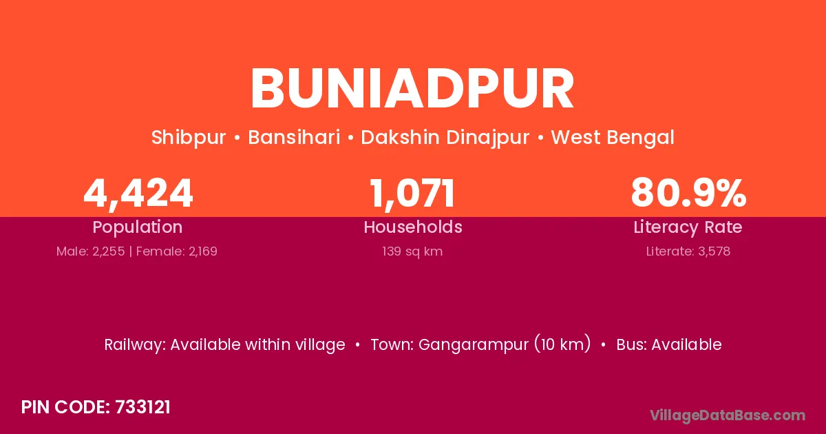 Gangarampur (10 km) is the nearest town to Buniadpur village for major economic activities and is located approximately 10 km away.
