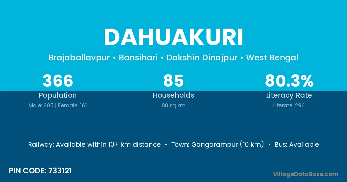 Gangarampur (10 km) is the nearest town to Dahuakuri village for major economic activities and is located approximately 10 km away.