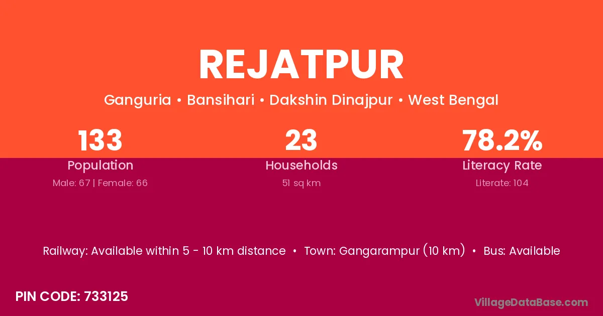Rejatpur village has a total population of 133 people, of which 67 are males and 66 are females.