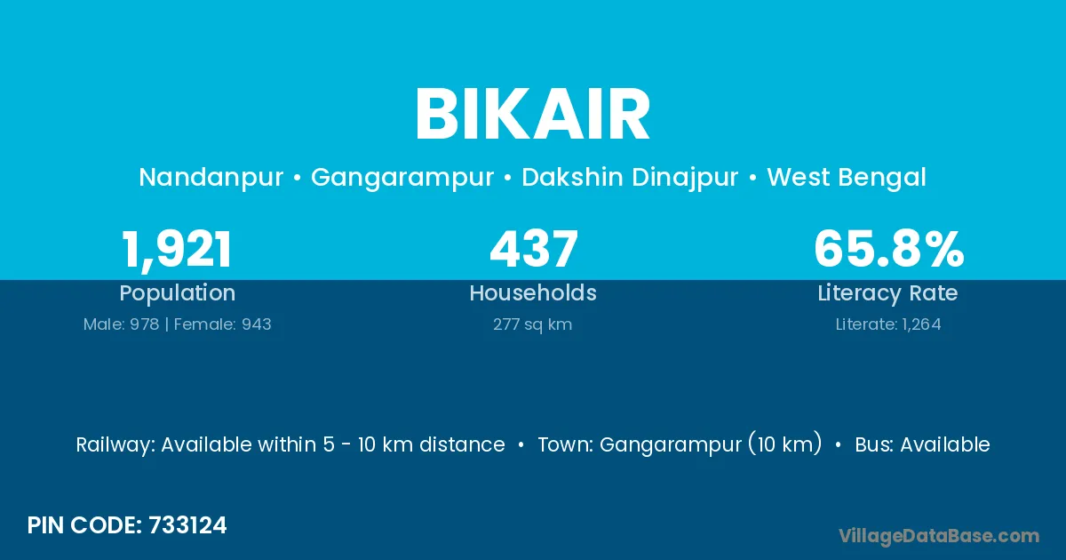 Gangarampur (10 km) is the nearest town to Bikair village for major economic activities and is located approximately 10 km away.