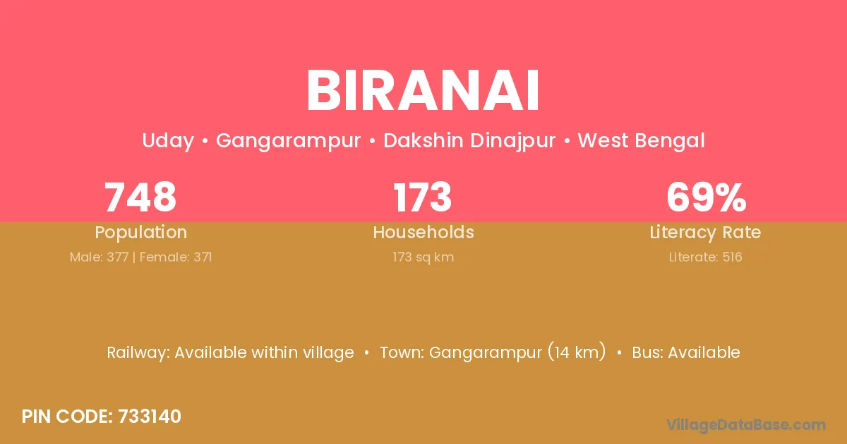 Gangarampur (14 km) is the nearest town to Biranai village for major economic activities and is located approximately 14 km away.