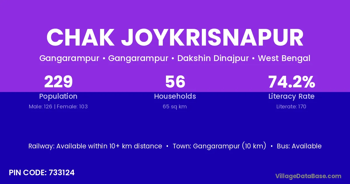 Chak Joykrisnapur village has a total population of 229 people, of which 126 are males and 103 are females.
