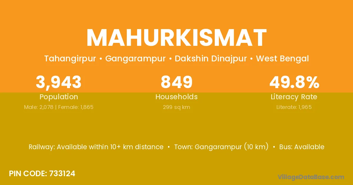 Gangarampur (10 km) is the nearest town to Mahurkismat village for major economic activities and is located approximately 10 km away.