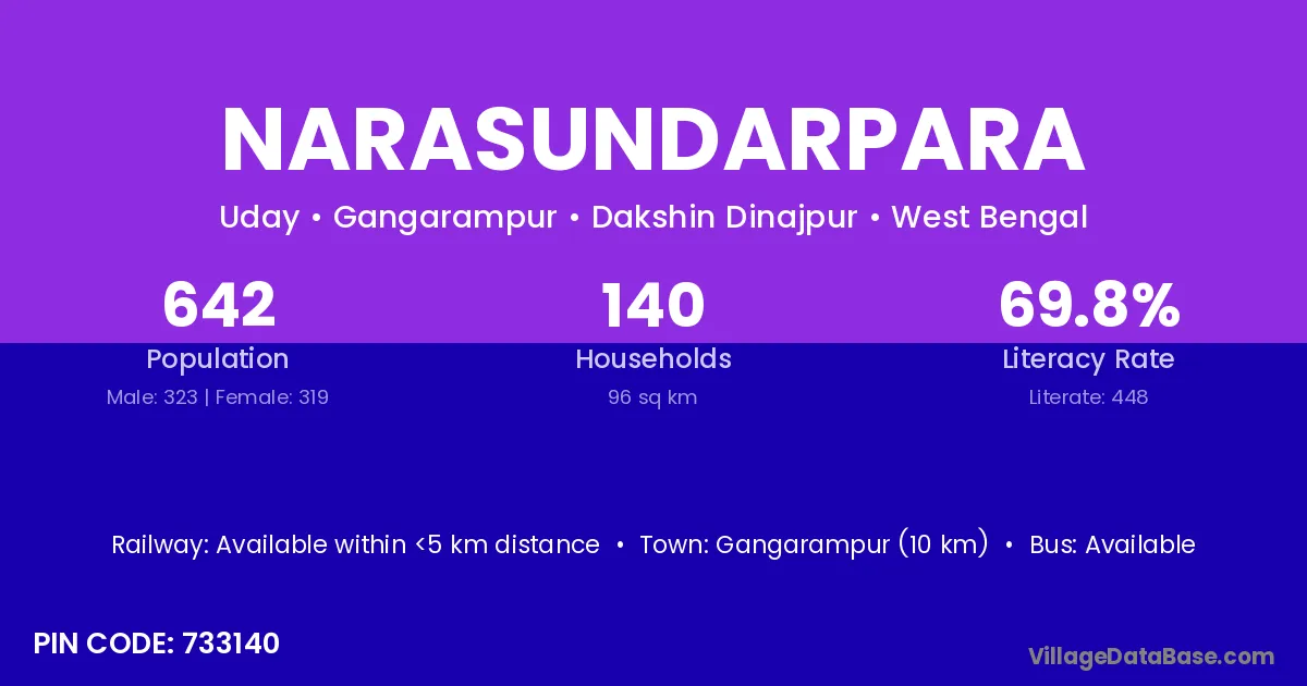 Gangarampur (10 km) is the nearest town to Narasundarpara village for major economic activities and is located approximately 10 km away.