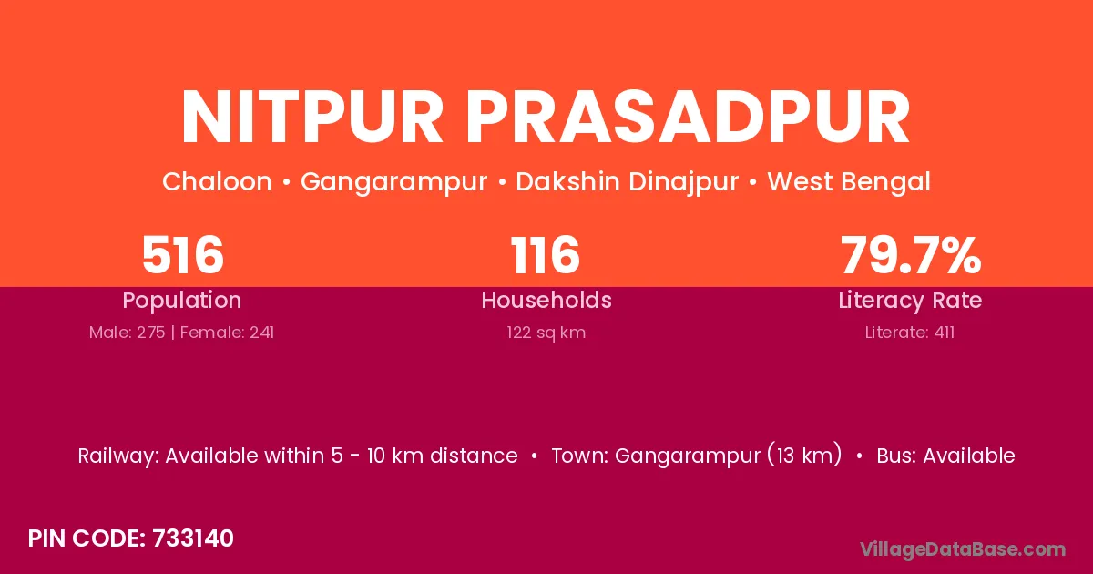 Gangarampur (13 km) is the nearest town to Nitpur Prasadpur village for major economic activities and is located approximately 13 km away.