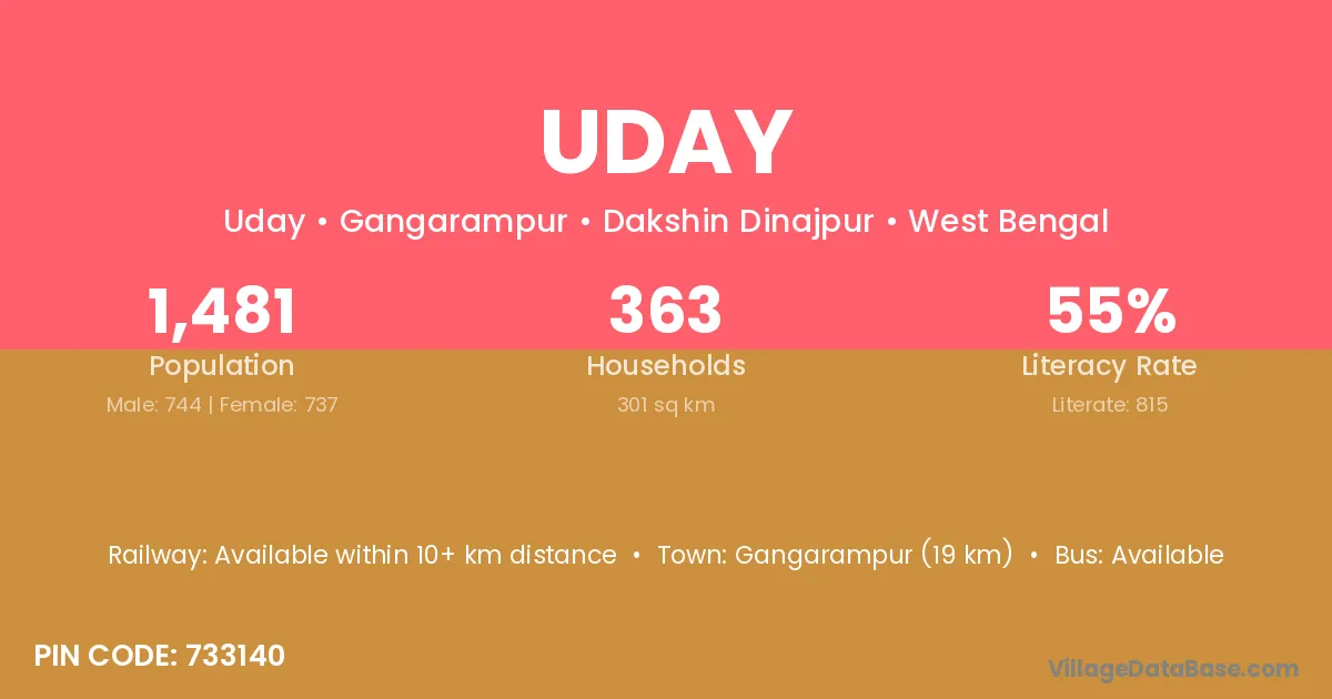 Gangarampur (19 km) is the nearest town to Uday village for major economic activities and is located approximately 19 km away.
