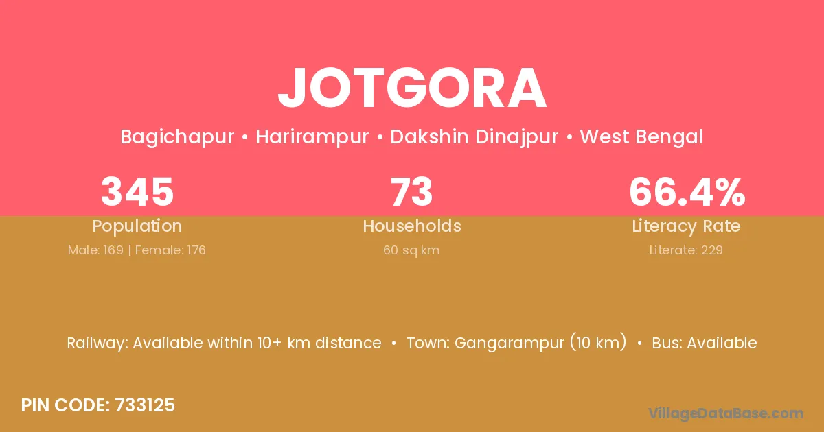 Gangarampur (10 km) is the nearest town to Jotgora village for major economic activities and is located approximately 10 km away.