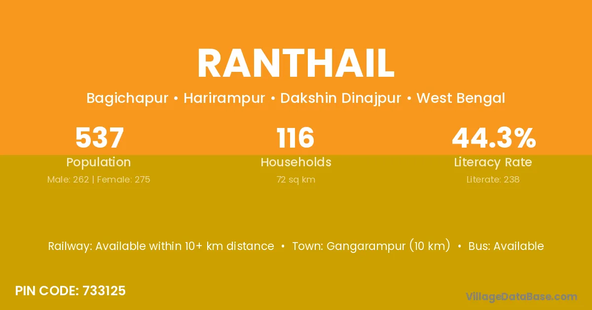 Gangarampur (10 km) is the nearest town to Ranthail village for major economic activities and is located approximately 10 km away.