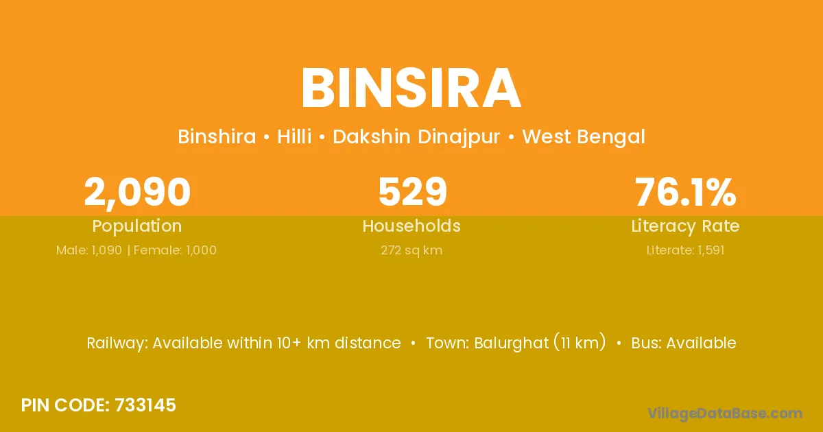 Balurghat (11 km) is the nearest town to Binsira village for major economic activities and is located approximately 11 km away.