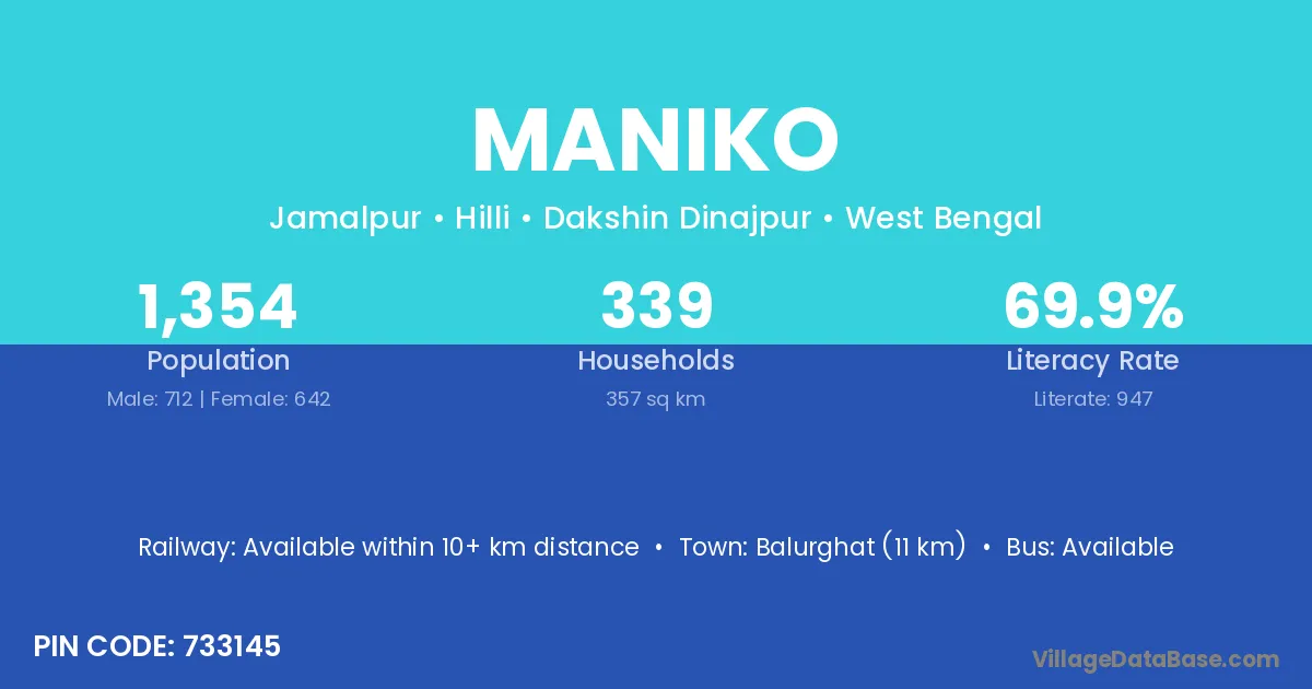 Balurghat (11 km) is the nearest town to Maniko village for major economic activities and is located approximately 11 km away.