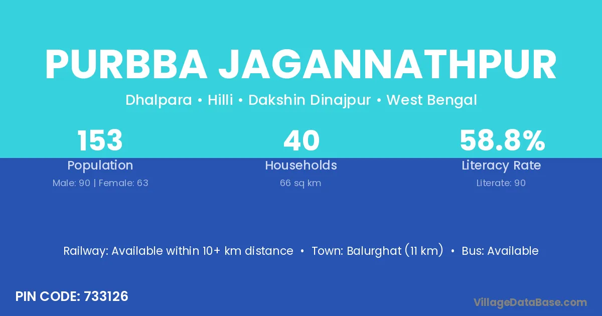 Balurghat (11 km) is the nearest town to Purbba Jagannathpur village for major economic activities and is located approximately 11 km away.