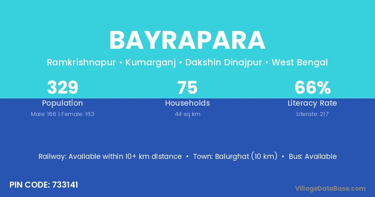 Balurghat (10 km) is the nearest town to Bayrapara village for major economic activities and is located approximately 10 km away.