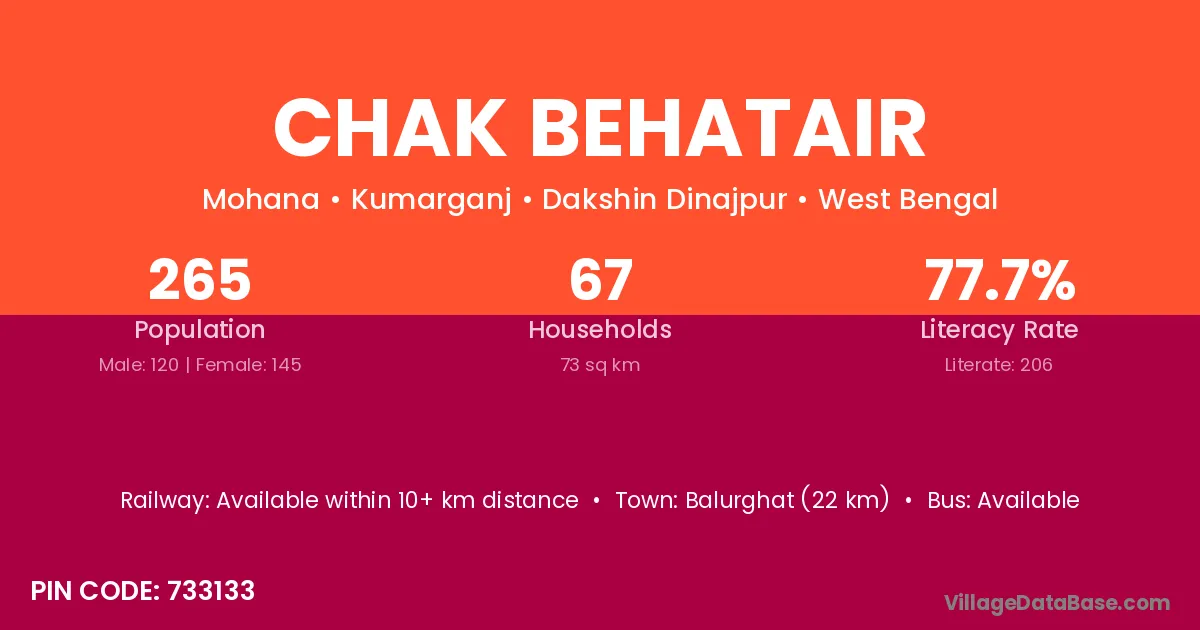 Balurghat (22 km) is the nearest town to Chak Behatair village for major economic activities and is located approximately 22 km away.